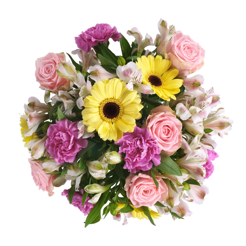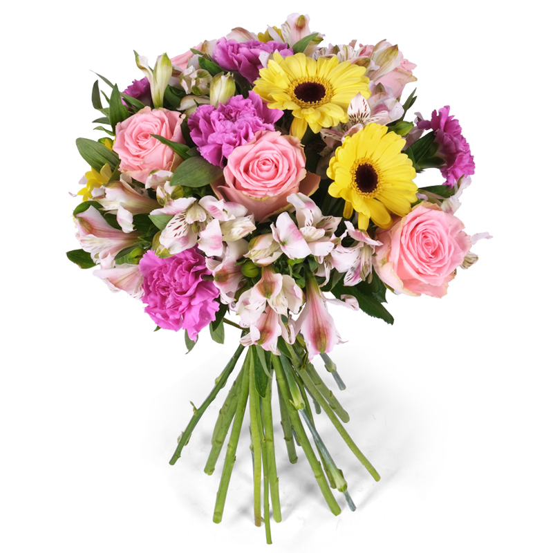 Subtelna kompozycja czterech gatunków. Róże o klasycznej formie, gerbery z wyrazistymi główkami, puszyste goździki i delikatne alstromerie. Bukiet trafiający prosto do serca. Podaruj bliskiej osobie chwilę radości!