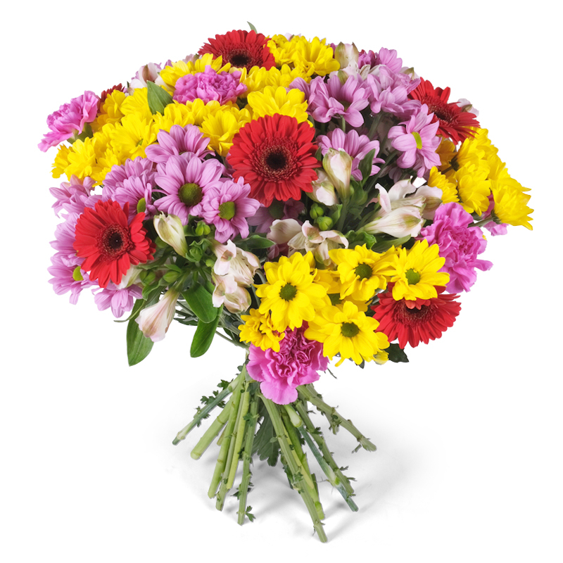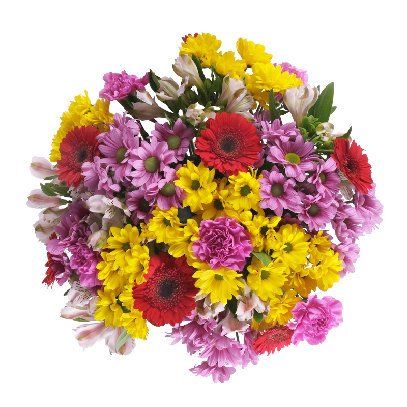 Zawsze świeże kwiaty Gerbery, santini, goździki i alstromerie układają się w kompozycję, która ma w sobie coś z letniego pleneru i niedzielnego rynku. Kwiaty są świeże i zachwycają barwami. Postawisz je w domu i nagle poczujesz, że powietrze jest lżejsze, a dzień jaśniejszy.